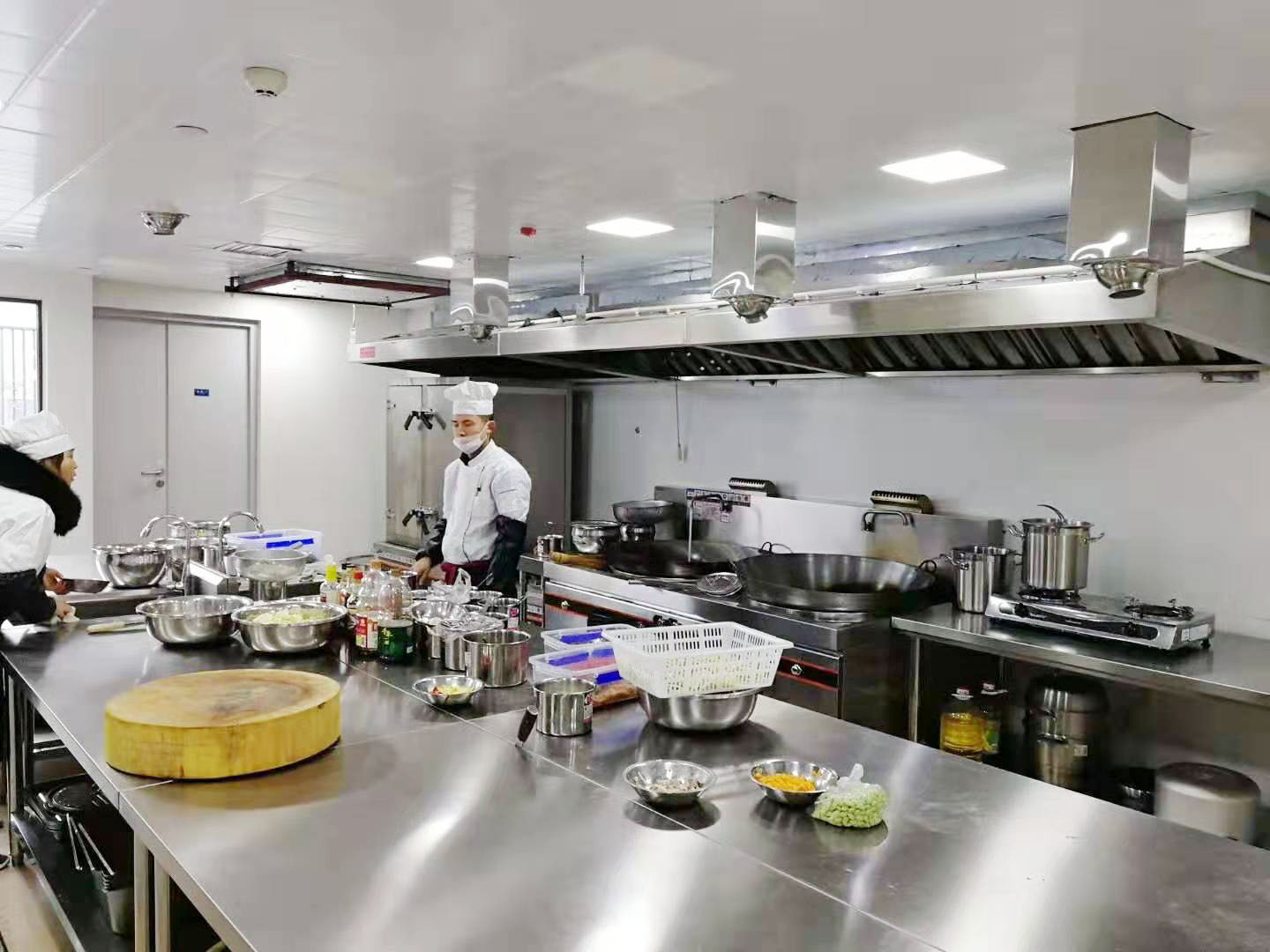 此間對新風的要求較低,但排風效果一定要好,否則,蒸汽將充滿整個工作間,影響廚師工作,排氣排出的主要是水蒸氣,可以不采用和淨化裝置,直接排出。