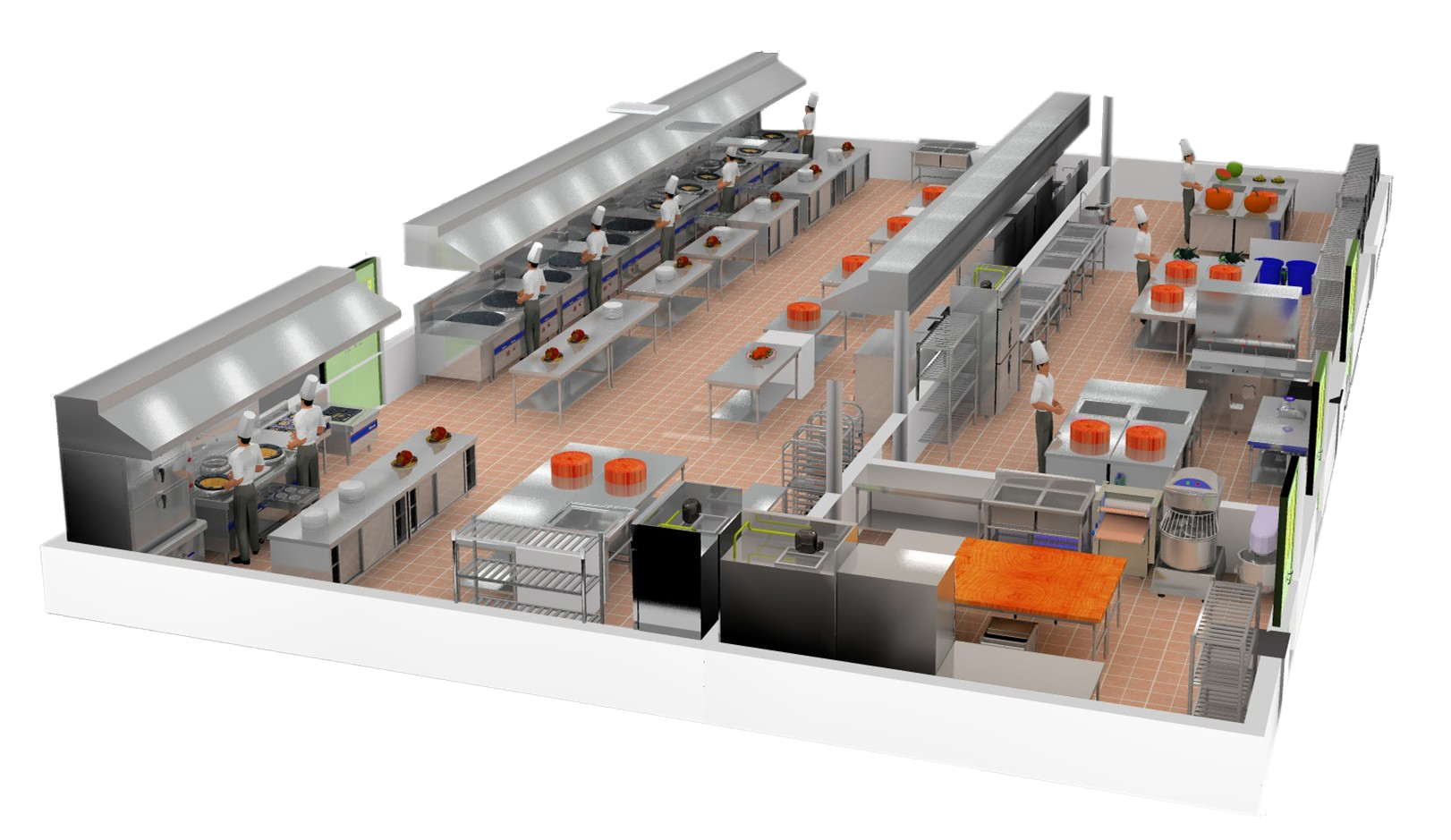 其次、星級酒店午夜视频免费在线观看也和小飯店午夜视频免费在线观看一樣,必須要有足夠的操作空間,因此必須要設計洗滌區、切菜去、烹飪區,這些區域的大小必須根據午夜视频免费在线观看的大小合理的分配空間,但是不能使人感覺擁擠。