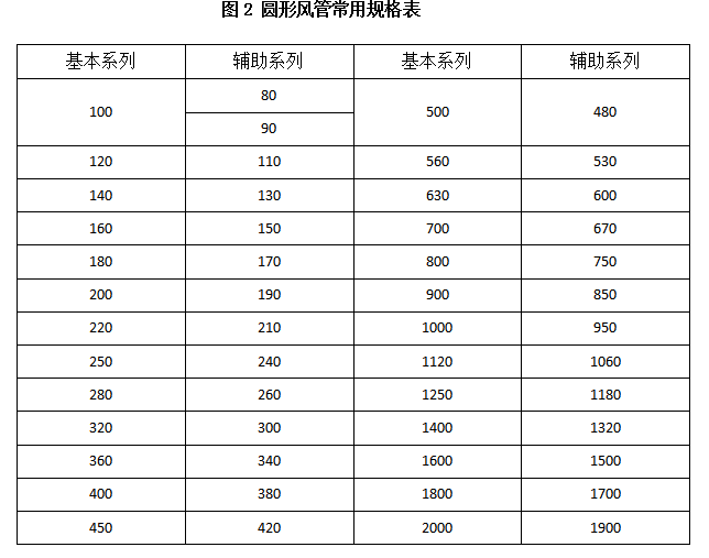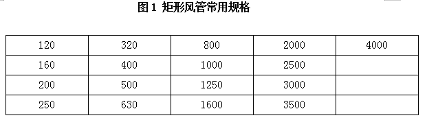 在安裝條件允許的情況下,在實際設計製作管道時,還需要根據需要選擇合理的結構尺寸。根據《通風管道技術規程》(JCJ141-2004)的規定,矩形風管的邊長與圓管直徑應盡量選用常用規格,見表1和表2。矩形風管長邊與短邊之比不宜大於4:1。金屬矩形風管宜以外邊長(或外徑)為標注尺寸;非金屬矩形風管宜以內邊長(或內徑)為標注尺寸。圓形風管應優先選用表2中的基本係列。以下各表選自《通風與空調工程施工質量驗收規範》(GB50243-2002)