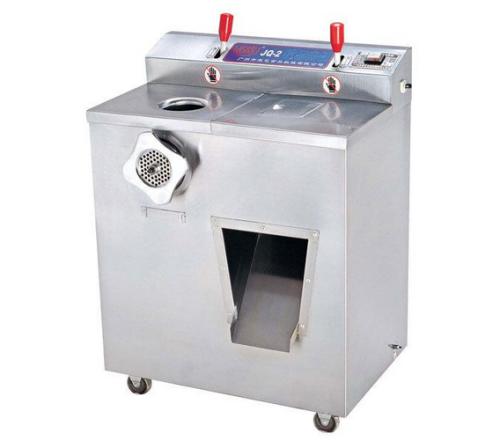 絞肉機由機架、傳動部件、絞軸、絞刀、孔格柵組成。機架為一箱體,傳動也很簡單,電動機輸出皮帶輪經一級減速,把動力傳遞給絞軸旋轉。絞軸是一根螺旋推進軸,用以輸送肉塊。絞刀連同絞軸一起旋轉,在絞刀與軸之間有剪切柵板。絞刀另一側是輸出肉餡的孔格柵。使用時要把肉分割成小塊並去皮去骨,再由入口投進絞肉機中,啟動機器後在孔格柵擠出肉餡。肉餡的粗細可由絞肉的次數來決定,反複絞幾次,肉餡則更加細碎。該機還可用於絞切各類蔬菜、水果、幹麵包碎等,使用方便,用途很廣。