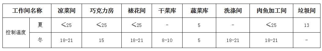 在規範中對工作專間有明確的定義:“指處理或短時間存放直接入口食品的專用操作間包括涼菜間、裱花間、備餐專間等。”午夜影院污在线观看這裏的專間包含了其他專用工作間。各種專間溫度控製參照規範的要求和一般做法。設計人員要結合實際提出設計要求,例如.大型食堂和快餐店,在就餐準備之前有大量的食材要加,特別是魚、肉、禽、在室溫下擱置較長時間,不能隨時進行冷藏保鮮,夏季對室內的溫度就要嚴格控製,或增加保鮮設備的容積、便於及時冷藏,防止經過浸泡、擇洗、改刀的食材變質。嚴格控製各區溫度和濕度是控製微生物生長、保證食品安全的關鍵。不同區域環境有不同的溫度和濕度要求。主食庫、調料庫、幹品庫隻要控製濕度,各加工區需要控製溫度,見下表
