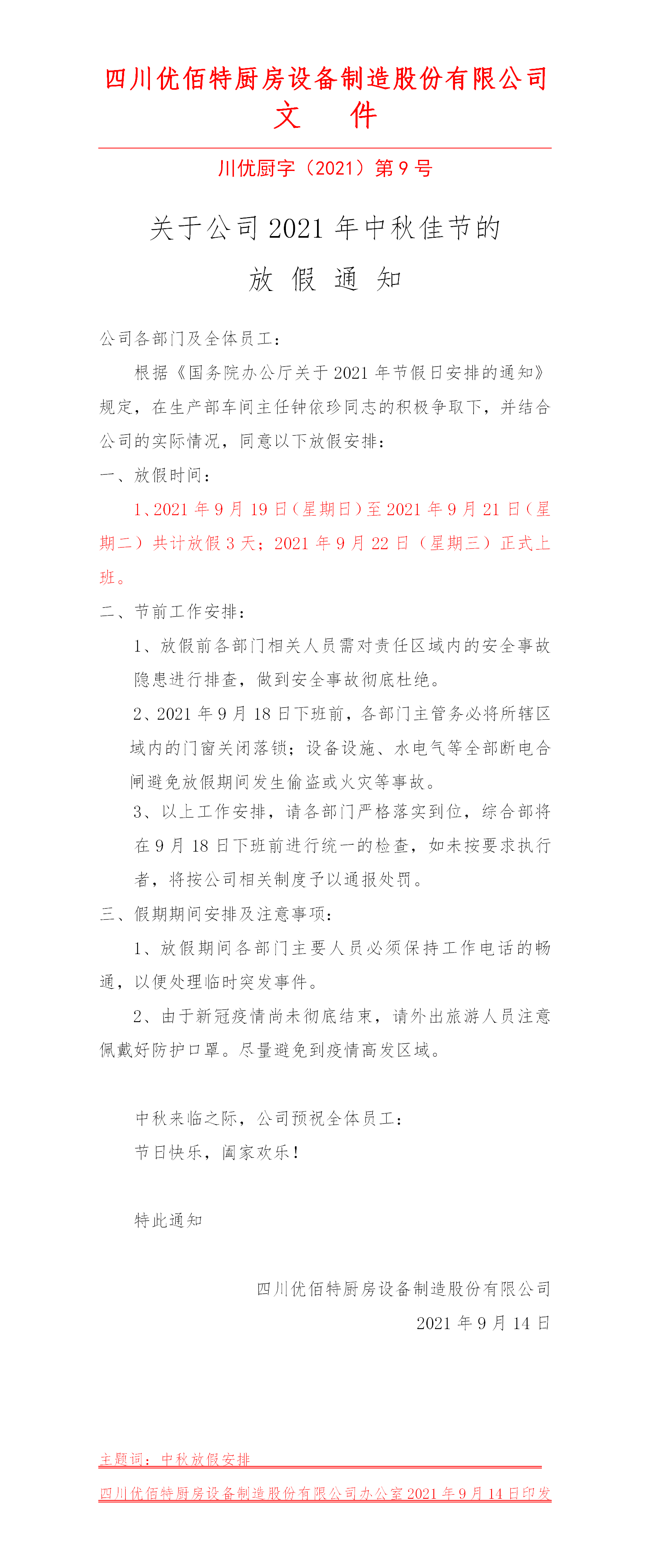 中秋佳節將至,為了迎接這個傳統節日,我公司根據國務院放假要求,並結合自身實際情況做出如下放假安排: