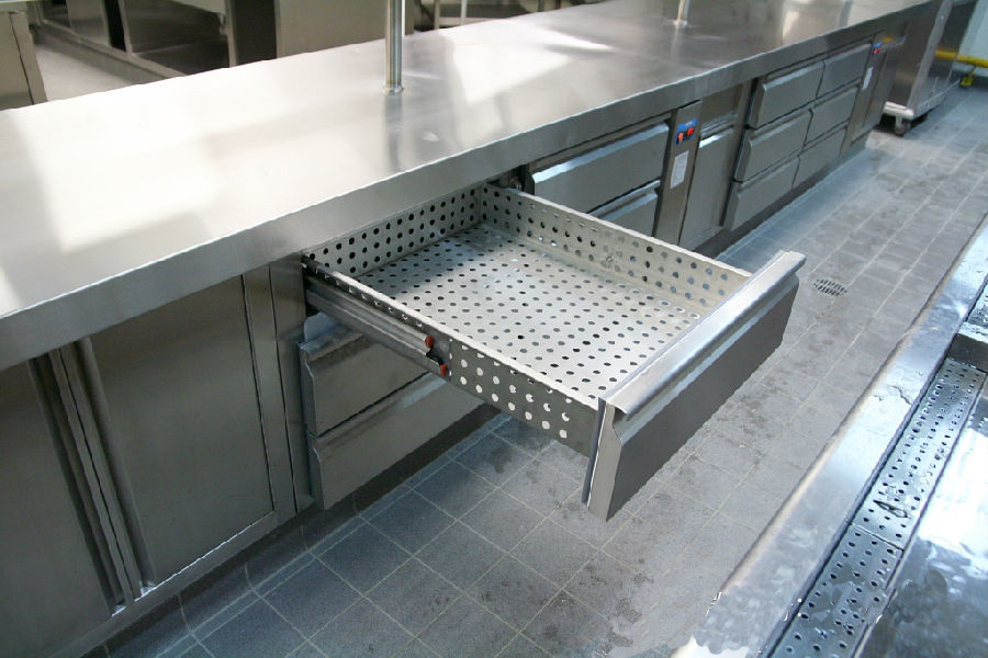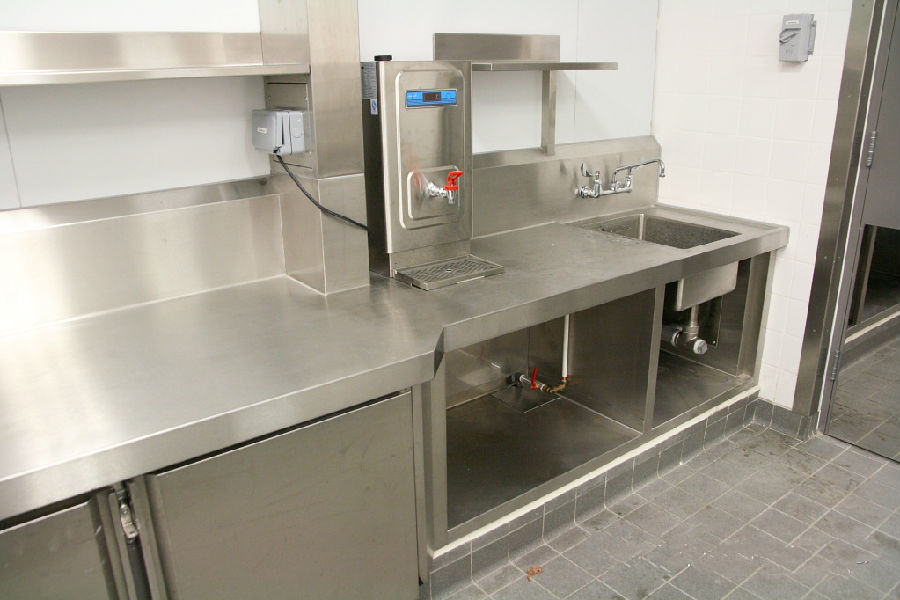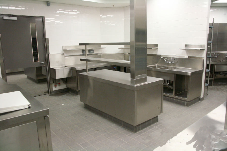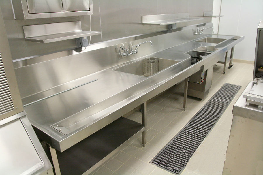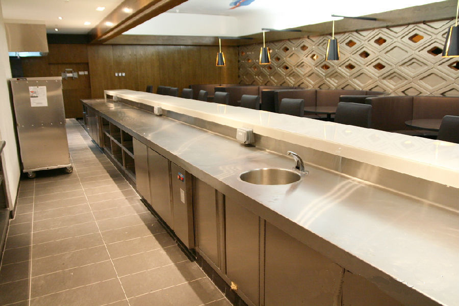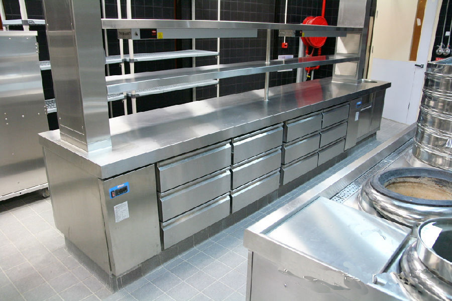 依然是一流的現場無縫焊接工藝,台麵非常平整,對土建(地台施工),現場焊接工藝,調理台的製造工藝要求非常高。工作台的背板用大弧度L型設計,避免藏汙納垢,容易清洗。