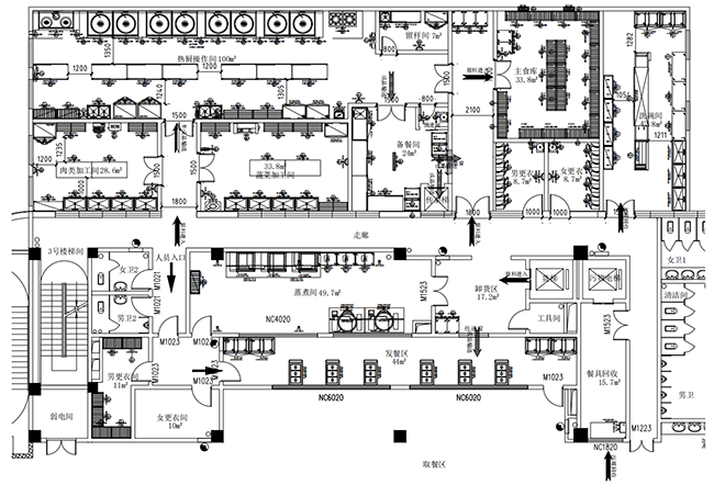 根據主通道位置與走向,以及各種工作流程走向,初步確定區域隔斷、進出門位置。各種工作流程有各自的路線,根據各行其道、不交叉、不回流、不穿越無關區域的原則,確定進料、出餐、收殘、餐具、垃圾的流程分通道。為保證工作流程快捷高效,要縮短傳送距離,截彎取直。較小的午夜视频免费在线观看若不能設分通道的午夜视频免费在线观看,也要利用運行路線、運行時間差,把不應交叉的流程區分開,要達到各行其道、不交叉、不回流、不穿越無關區域的要求。