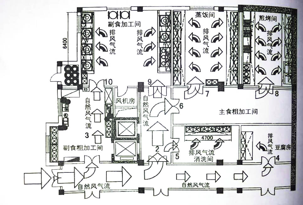 首先,圖一是一個學校食堂的半地下午夜视频免费在线观看,售飯區和明檔在二、三層,傳菜收殘全部用傳菜梯,午夜视频免费在线观看有一個出入口1號門。由於不補充新風,負壓太大,主食加工的蒸飯間和前烤間出入口7號、8號門關門後就很難打開,此時,下水道的汙氣、汙水回流。